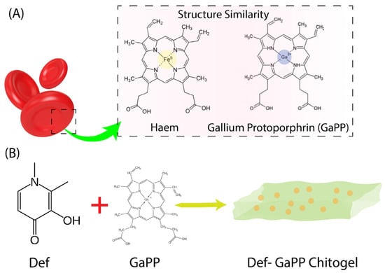 (A) Schematic illustration of haem and GaPP structural similarities. (B) The structure of Def combined with GaPP to be incorporated into Chitogel for wound healing applications.