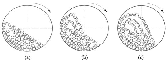 The grinding process is determined by the operating mode of the SAG mill, which, in turn, depends on the rotation speed of drum. At a low mill rotation speed (50–60% of the critical speed), the whole ball load makes a turn toward the rotation by some angle, and at a constant rotation speed, it remains in this position. The balls continuously circulate, rising with slippage along concentric circular trajectories and rolling down in parallel layers on other underlying bodies. This mode of mill operation is called a cascade mill (Figure 1a). Grinding of the material occurs mainly by crushing and abrasion by the rolling balls. Cascade mode of mill operation is characterized by fine grinding with increased sludge output and increased wear of the lining due to slippage of the rock-ball loading on the drum wall and, as a consequence, abrasive wear [49]