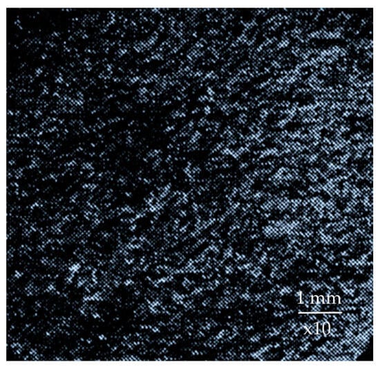 Contact fatigue wear is observed in the mill at all types of operation modes in the process of grinding relatively soft rocks such as, for example, limestone. The rock particles, due to low stresses, cause elastic rather than plastic deformation of the lining metal. Repeated cyclic contact of the medium with the surface leads to the appearance of a network of microcracks on the surface of the lining. Further microcracks grow deep into the material and lead to the formation of fatigue crack, which causes destruction and removal of metal fragments of the surface layer [50]. A view of the lining is shown in the figure, which shows that the surface is covered with elongated elevations and microcraters (Figure 2b).