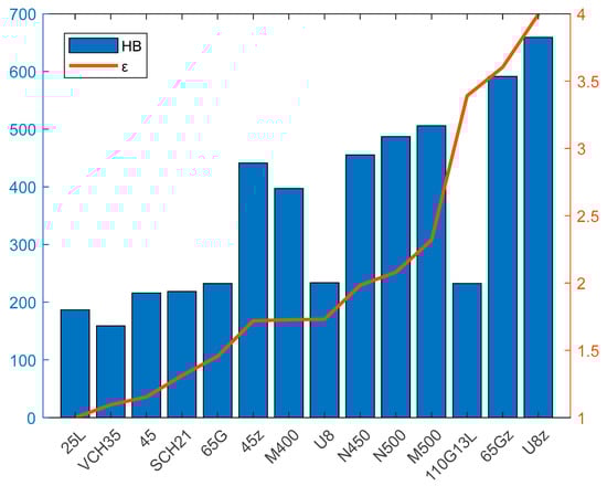 The results of the experiment according to Table 3 are shown in the diagram presented in Figure 6, where the comparative coefficients of wear resistance ε of the analyzed materials relative to steel 25L, which is taken as a reference. The materials are arranged in the order of increasing ε in comparison with their hardness.
