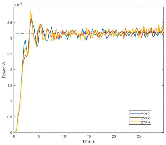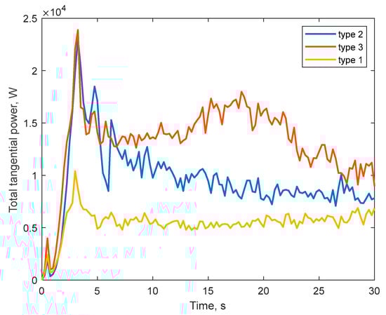 As can be seen from Figure 18, at the beginning, the mill speed is calculated with the initial conditions. The initial estimated motor speed is about 10 rpm for the first two liner types and 11 rpm for the third type. It can be seen that when the time and speed of the motor is zero, it reaches the target speed in the short period of time and tends to be stable. After the lag time, the speed of rotation is recalculated considering the determination of the maximum of the grinding speed function. The lag time in this case is added artificially but can actually vary depending on the transient time. After recalculation, the rotational speeds for the three types of liners are 12.74, 13.12 and 14.86 rpm, respectively.