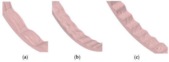 To determine the wear resistance parameter K, we were guided by the fact that it should provide accelerated wear of the geometry compared to the real one. However, it should not lead to rapid and abrupt changes in the geometry, violating the other parameters of the mill operating mode (nature of the medium movement). In practice, the determination of wear resistance parameter is based on calibration from known experimental data, such as the loss of height or mass of liner elements with time [54]. According to the data obtained in production conditions [49], the linings of mill MSHTS 5500 × 6500 are changed at full wear of the wave-shaped lifter profiles, on average, after one year (l = 0.076 m/year).