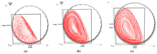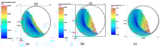 During simulation in Rocky DEM at the obtained rotational speeds and liner types, it was found that material movement occurred in waterfall mode (Figure 12c). After further specification of the particle size distribution (reduction of large fraction) in MPC, the rotational velocity decreased, and as a result, the transition to the cascade mode took place (Figure 12a). Recalculation will also occur when other parameters are adjusted.