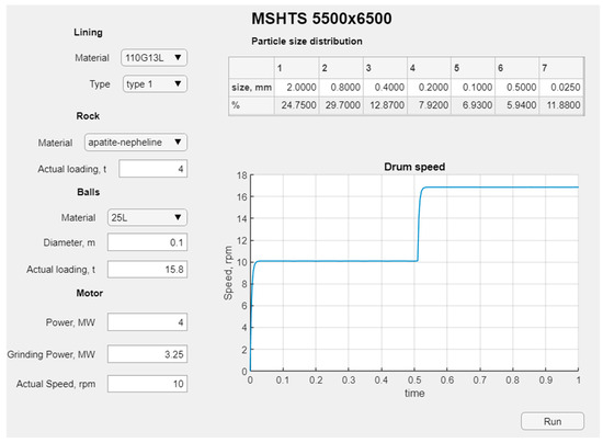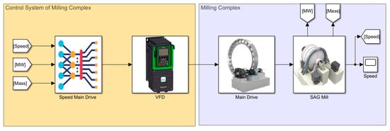 Based on the results obtained in the presented work, the structure of the automatic control system using VSD was developed. The regulation of the mill drum rotation speed, through the use of VSD in various operating conditions, can effectively reduce energy losses, increase productivity and extend the service life of the equipment [45]. However, the relationship between the optimum rotational speed and various process parameters has not received much attention.