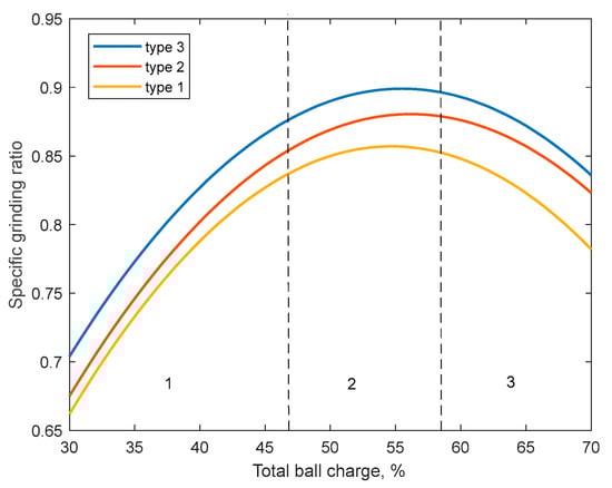 where τ—the discrete time; —the degree of ball loading in the mill, which is a nonlinear function of material size reduction; t/h, —the mill rotation speed, rpm; ω—takes into account the lifter geometry, internal diameter and ball material; , (h·rpm·%)/t.