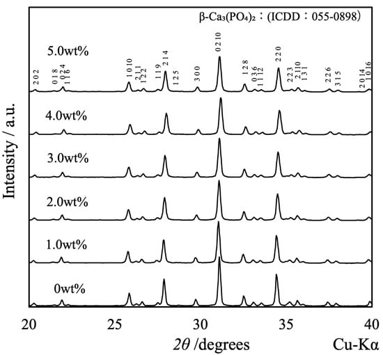 Figure 5 shows the XRD patterns acquired from the β-TCP composite sintered bodies in which varying concentrations of SiO2 nanoparticles were dispersed. The peaks generated by each specimen were consistent with those of β-TCP (ICDD no. 055-0898), indicating that all samples had the same crystal structure as β-TCP []. Because the patterns of these sintered bodies were not modified, it appears that the SiO2 did not form a solid solution within the β-TCP crystal structure. Furthermore, no peaks related to SiO2 or various by-products were obtained, presumably because of the low concentration or amorphous nature of the SiO2. Interestingly, the XRD pattern generated by a specimen containing 10 wt% SiO2 contained peaks attributed to cristobalite (ICDD no. 001-043). This result suggests that the SiO2 nanoparticles added at lower concentrations were also changed to cristobalite upon heating.
