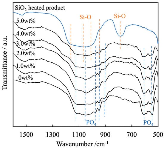 Figure 6 presents the FT-IR spectra of these same sintered bodies. The spectrum of a sample of heated colloidal SiO2 is also shown in the figure. Each of these spectra contains peaks ascribed to the bending and stretching vibrations of PO4 groups (attributed to the presence of calcium phosphate) within the ranges of 550 to 605 cm−1 and 905 to 1120 cm−1, respectively. In contrast, there are no peaks related to by-products such as hydroxyapatite or Ca2P2O7 [,]. In the FT-IR spectrum of the heated SiO2 sample shown in the figure, absorption spectra attributed to Si-O-Si stretching vibration and bending vibration of SiO2 were observed at 1000–1200 cm−1 and 800 cm−1, respectively [,], but as in the X-ray diffraction results, these absorptions could not be clearly distinguished. XRD patterns and FT-IR spectra showed no evidence of synthetic reactions such as compounding or substitution of the blended SiO2.