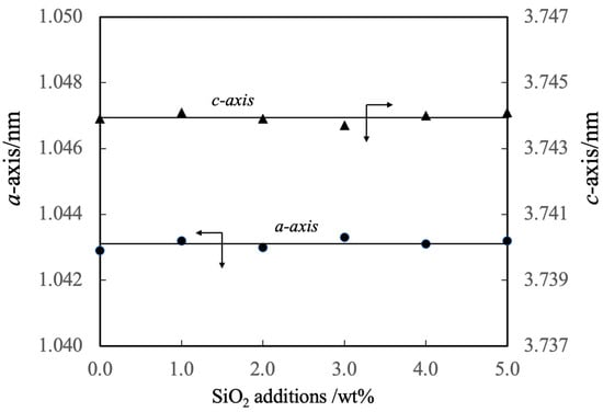 The lattice constants of these specimens are summarized in Figure 7. These values indicate that the added SiO2 did not form a solid solution with the β-TCP. However, it should be noted that the authors previously prepared β-TCP in which silicon ions were substituted at phosphorus sites []. Although the composition of the β-TCP was not modified upon adding SiO2 in the present work, prior work demonstrated that the increased negative charge resulting from the replacement of PO43− with SiO44− ions was compensated for by the incorporation of Ca2+ ions. Hence, the Ca/P molar ratio was increased above the stoichiometric value of 1.50. In the present study, it is appears that silicon ions were not substituted into the β-TCP lattice because cations were not available to compensate for the associated change in charge.