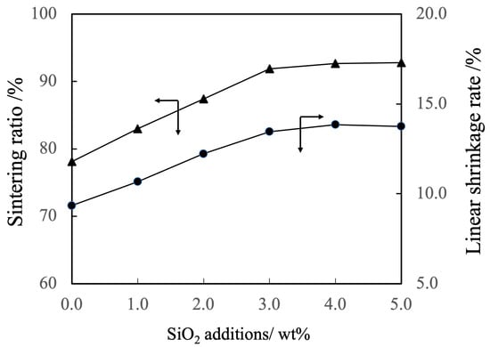 Sintering ratios and linear shrinkage rates of β-TCP composite sintered bodies incorporating varying amounts of SiO2 nanoparticles. Closed circles and triangles indicate linear shrinkage rate and sintering ratio, respectively. The direction of the arrow indicates the relationship between the axes in the figure.