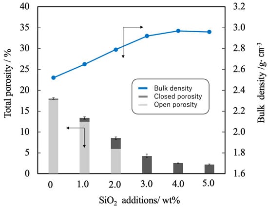 Figure 9 summarizes the porosity and bulk density values for sintered bodies. The bulk density of the β-TCP was 2.54, supporting the linear shrinkage and sintering data. In contrast, the bulk densities of the sintered bodies containing 3.0 wt% or more SiO2 were in the range of 2.95 to 2.98 g·cm−3 (compared with a theoretical density of 3.07 g·cm−3). These data demonstrate that the bulk density was increased with increases in SiO2 content in this range. Conversely, the open porosity values of the sintered bodies decreased with increasing SiO2 addition up to 2 wt% whereas the closed porosity values decreased with SiO2 addition above 3 wt%. The decrease of porosity indicates that the sintering characteristics of the material were improved.