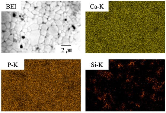 EDX-SEM images of β-TCP composite sintered bodies with 4.0 wt% SiO2 nanoparticles.