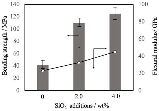 Bending strength and flexural modulus values of β-TCP composite sintered bodies incorporating varying amounts of SiO2 nanoparticles. The bar graph shows the bending strength, the opened circles the flexural modulus. The direction of the arrow indicates the relationship between the axes in the figure. Error bars indicate standard errors.
