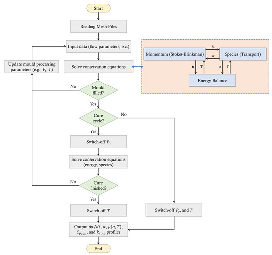 The numerical framework solves conservation equations utilising ANSYS Fluent for momentum, continuity, energy, and chemical reactions. The convection–diffusion–reactive flows are simulated adopting the VOF method based on a FVM scheme for discretising the conservation form of the Partial Differential Equations (PDEs). The numerical solver allows for compiling User-defined functions or scalers—C-based codes—that are used to hook the developed functions (e.g., source terms, fluid properties, etc.) to ANSYS Fluent. The reason for this is that the standard features of the commercial code (Fluent) do not supply time/temperature/cure-dependent models (e.g., the chemo-rheology model) which require the customisation of such model parameters by creating UDFs and a defined scalar (i.e., degree of cure) to attain a twinning (linkage) technique for sophisticated thermo-chemo-flow modelling. A flow chart illustrating the developed numerical framework is given in Figure 1.
