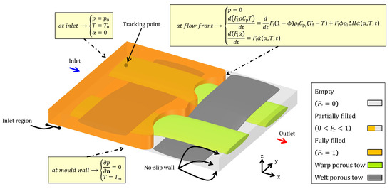 The thermo-chemo-flow simulations are performed on a Representative Volume Element (RVE) model. This RVE of a woven fabric, a plain weave, is designed by ANSYS DesignModeler—a feature-based parametric solid and surface CAD (Computer-Aided Design) modeler. This is followed by meshing, whereupon a mesh-independence study is carried out to acquire appropriate and accurate solutions. For further details, the current authors [55,56] conducted and thoroughly discussed a convergence and grid (mesh) independence study in their previous numerical works. Such an RVE will include open (inter-tow) and porous (intra-tow) regions to quantify a two-scale (micro-meso) fill model that will yield a value representing the macro-scale level of the resin flow. Figure 2 illustrates the boundary conditions (b.c.) within a rectangular RVE domain comprising an extended inlet region of . The inputs required for the thermo-chemo-flow model, for instance material and process parameters, and simulation/discretisation details/schemes, are summarised in Table 1 and Table 2, respectively. The experimental data (of García-Martínez et al. [27]) adopted in the present work does not supply exponents values, and hence, they are assumed as and 1 for a and b based on the work by Shojaei et al. [13].