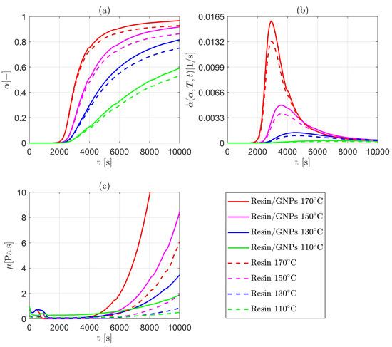 Numerical results for the cure and chemo-rheology of resin/GNPs (modified) and resin (non-modified) during LCM process: (a) degree of cure (chemical conversion); (b) rate of crosslinking reactions; and (c) development of viscosity (rheology).