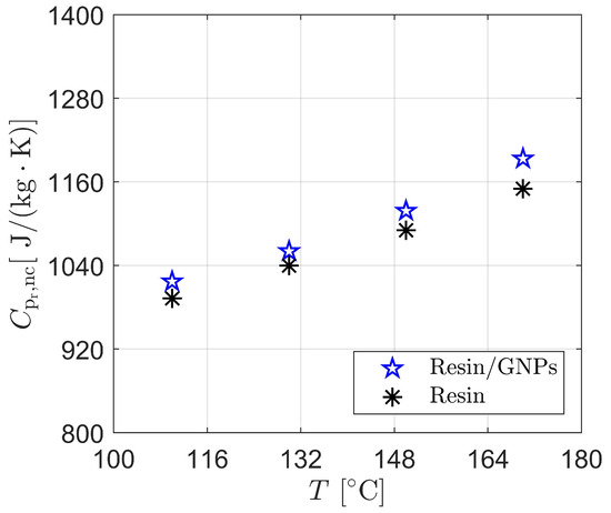 Numerical determination of specific heat in resin/GNPs (0.2 wt.%) and “neat” resin during LCM process: Enhancements in the specific heat (higher) are observed with the additions of GNPs to the thermoset polymer.