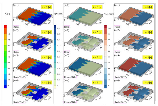 The development of the heat flow parameters during the filling and post-filling stages are illustrated in Figure 6 and Figure 7, respectively. This is an e-monitoring feature that is efficient in describing liquid phase progression and property behaviour changes utilising the VOF approach. Thermal conductivity and the specific heat of the resin system increase in the early stage of the impregnation process due to the exothermic (cross-linking) reaction triggered by heating temperature—see Figure 6. Such an increase will reach a maximum and then stabilise until bottom-wall temperature disconnection. The nanofillers’ impact can be seen in Figure 6 and Figure 7, accelerating the movement of heat within the liquid resin, stimulating higher rates of reaction, and hence higher (enhanced) heat transfer properties—e.g., comparing (b-2) and (b-4) in Figure 6, or (a-2) and (a-4) in Figure 7.