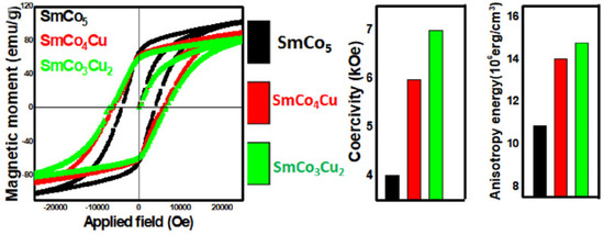 - Téllez-Blanco, J.C.; Grössinger, R.; Turtelli, R.S. Structure and magnetic properties of SmCo5−xCux alloys. J. Alloys Compd. 1998, 281, 1–5. [Google Scholar] [CrossRef]