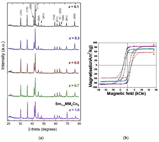 - Miyazaki, T.; Takahashi, M.; Yang, X.; Saito, H.; Takahashi, M. Formation of metastable compounds and magnetic properties in rapidly quenched Sm (Fe1−xCox)5 and Sm2(Fe1−xCox)7 alloy systems. J. Appl. Phys. 1988, 64, 5974. [Google Scholar] [CrossRef]