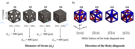 In this study, a hierarchical design process based on the assembly of a pre-defined set of basic unit cells was used for functional grading. Body Diagonal-Face Diagonal Cubic (BD-FDC) unit cells, according to the naming convention presented by Shi and Akbarzadeh [46], were selected as basic unit cells for assembling 2nd order hierarchical lattice structures. Each basic unit cell in the assembly took one out of four possible orientations and had a strut diameter assigned from four sizes ranging from 300 μm to 600 μm that corresponded to four different solid volume fractions from 37% to 79% for each sample (Figure 1). With different combinations of a total of 16 available types of basic unit cells (four unit cell orientations and four-volume fractions), functional grading of the lattice structure was achieved. A more detailed description of the hierarchical design process will be communicated in a separate publication.
