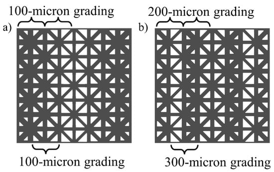(a) Type L lattice with 100-micron thickness difference grading. (b) Type S lattice with 200-micron and 300-micron thickness difference grading. Both (a) and (b) are shown in the X-loading direction.