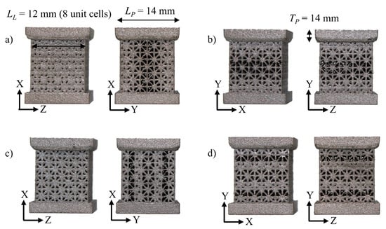 A total of 8 compression samples shown. Each sample group shows the front and the side views. For clarity, dimensions are distributed in different photos, but all the samples are manufactured to the same size. LL: Lattice body length. LP: Plate length. TP: Plate thickness. (a) X-direction type L, (b) Y-direction type L, (c) X-direction type S, and (d) Y-direction type S.