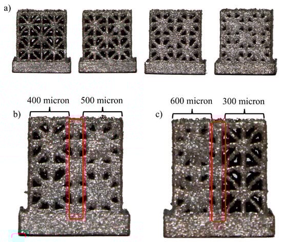 A total of five micro-CT samples were designed and manufactured, including four samples of uniform strut diameters ranging from 300 microns to 600 microns with an interval of 100 microns (Figure 4a) and an additional sample that included transitions between unit cells of varying sizes, ranging from 100 microns for smoother transitions to 300 microns for sharper transitions (Figure 4b,c). Due to the limited X-ray power of the available desktop micro-CT scanner model and limited field of view, micro-CT specific samples were designed on a 4-by-4-by-4 grid using the same basic unit cells with side lengths of 1.5 mm, making them compact enough to fit inside the field of view of the scanner. A solid plate with a width of 8 mm and thicknesses of 2 mm was added at the bottom of each lattice design for marking and easy mounting onto the micro-CT platform. The micro-CT samples were manufactured using the same method as compression testing samples.