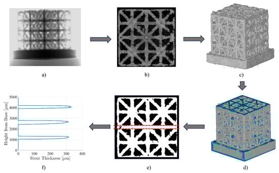 Process flowchart of micro-CT processing from scanning 3D-printed lattice samples to measuring the cross-sectional areas of horizontal struts. (a) X-ray image. (b) Processed CT image using the companion software. (c) 3D reconstructed model using marching cube algorithm via MATLAB. (d) Global registration of the 3D reconstructed model (grey) with the original design model (blue) via Geomagic 2017. (e) Strut thickness measurement of binarized slices via MATLAB. (f) Strut thickness measurements over all the slices in the vertical direction.