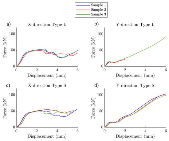 Unprocessed force-displacement data directly from MTS (unit conversion from inch to mm is done) for (a) X-direction type L, (b) Y-direction type L, (c) X-direction type S, and (d) Y-direction type S.