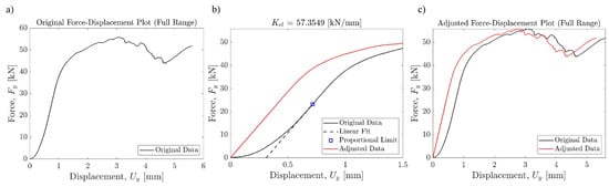 Post-processing of the raw force-displacement data from MTS. (a) Raw force-displacement curve. (b) Linearization of elastic region. (c) Comparison of raw and processed force-displacement curve.