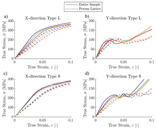 True stress–strain curves for (a) X-direction type L, (b) Y-direction type L, (c) X-direction type S, and (d) Y-direction type S samples processed from raw MTS data. Solid lines represent all the compression samples, including the top and bottom plates, and dashed lines represent only the lattice parts.