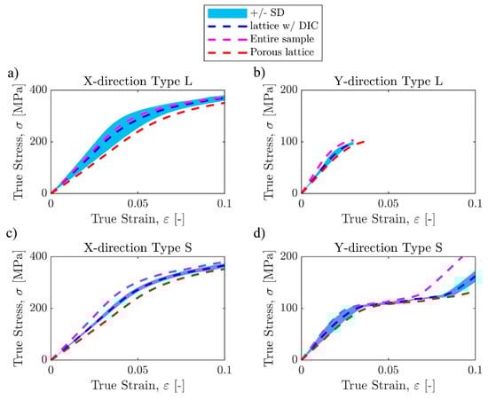 Average raw true stress–strain curves and DIC processed stress–strain curves with +/− one standard deviation. (a) X-direction type L. (b) Y-direction type L. (c) X-direction type S. (d) Y-direction type S.