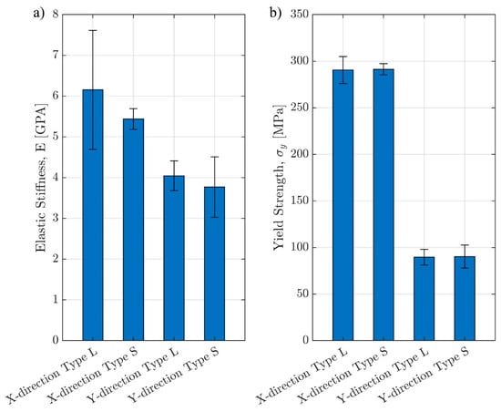 Comparison of (a) elastic stiffness and (b) yield strength by sample group. Error bars show standard deviations.