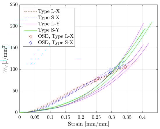 where is the strain of the point at which the energy absorption is estimated, and is the stress at that point. The onset strains of densification (OSD) were calculated for all the X-direction samples by identifying the global maximum [48] when using the maximum efficiency method proposed by Li et al. [49]. The energy absorption efficiency parameter is defined as the energy absorbed per unit volume (WV) at a given point divided by the stress at that point, given by Equation (2).