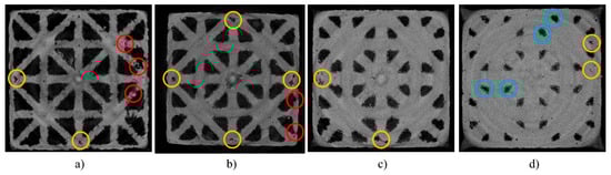 Reconstructed micro-CT slices for uniform samples with manufacturing-induced defects. Strut diameters are (a) 300 micron, (b) 400 micron, (c) 500 micron, and (d) 600 micron. Yellow circles: manufacture-induced defective pores. Red circles: Manufacturing-induced disconnected struts. Blue circles: loss of geometric conformity.