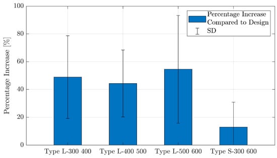 The dimensional accuracy measurements of horizontal struts revealed a 25 to 40% increase in cross-sectional areas (Ast) of as-built samples compared to original designs for uniform and type L designs, which is significantly larger than an average of 13% increase for type S as-built samples (p = 0.0256 when comparing type L and type S designs), as shown in Table 3 and Figure 14. These differences in cross-sectional areas are equivalent to a 12 to 20% increase in strut widths for lattices with uniform density and type L grading and 6% larger strut widths for sharply graded struts. The reason why graded designs have fewer available struts is that the graded struts were all integrated into one sample. In contrast, the uniform designs have a total of 4 samples for different strut diameters, thus providing more data.
