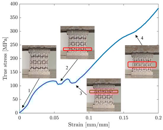 Additionally, the DIC-adjusted stress–strain curves were used to calculate the samples’ energy absorption capacities. For a compressed cellular structure, the energy absorbed per unit volume (WV) is the area under the stress–strain curve and can be calculated using Equation (1).