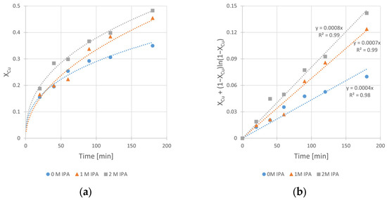 The influence of isopropanol (IPA) concentration on the kinetics of copper leaching from chalcopyrite: (a) the conversion (X) over time; (b) XCu + (1 − XCu)ln (1 − XCu) over time. Conditions: T = 40 °C, CH2SO4 = 0.5 M, CH2O2 = 1 M, vRPM = 400 RPM.