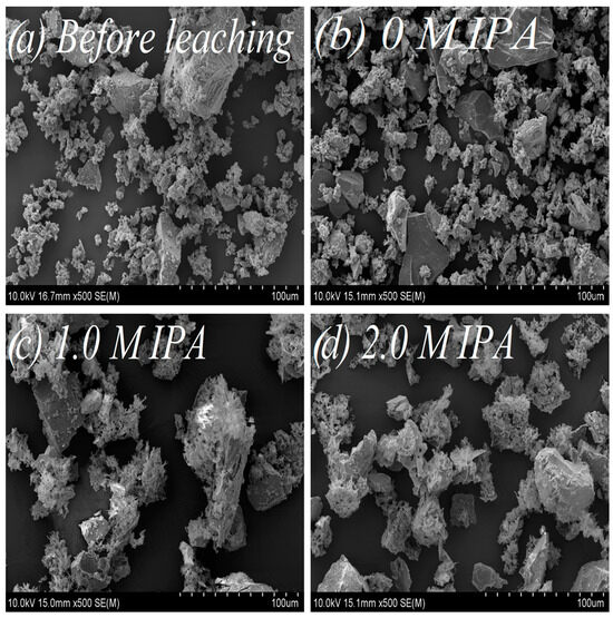 The SEM images vividly depict the influence of IPA on chalcopyrite surface morphology. The un-leached sample (Figure 5a), characterized by a relatively undeveloped surface, and the leached chalcopyrite sample without IPA addition (Figure 5b) exhibit similarities. However, following the addition of IPA (1.0 and 2.0 M IPA), notable transformations unfold—the chalcopyrite surface becomes subtly smoother, spongy, and more porous, as illustrated in Figure 5c,d.