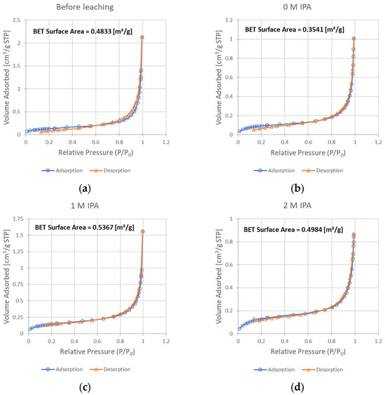 Results of the BET analysis—isotherms of adsorption and desorption, as well as resulting BET surface area values: (a) sample before leaching; (b) solid residue after leaching without IPA in the system; (c) solid residue after leaching with 1 M IPA concentration; (d) solid residue after leaching with 2 M IPA.