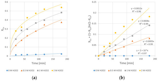 The influence of H2O2 concentration (CH2O2) on the rate of chalcopyrite leaching: (a) the conversion (X) over time; (b) XCu + (1 − XCu)ln (1 − XCu) over time. Conditions: mChal. = 2.0 g, T = 40 °C, V = 200 mL, CH2SO4 = 0.5 M, CIPA = 2.0 M, vSR = 400 RPM.
