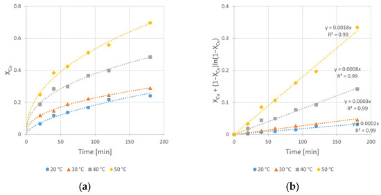 The analysis of these results clearly shows the beneficial influence of the IPA on the kinetics of copper leaching in H2SO4–H2O2 solution. It is clearly seen from Figure 4b that the increase in the slope (corresponding to kobs of the reaction) of the relationships takes place with the increase in IPA content in the system. The kobs value increases twice, from 4 × 10−4 min−1 (for the solution without IPA presence) to 8 × 10−4 min−1 (for the solution containing 2 M of IPA). The same beneficial effect of IPA addition can be observed in Figure 4a for leaching efficiency, represented by maximum conversion value (XCu,max) reached after 180 min. There is a visible difference in conversion (XCu,max) between a run without IPA and that with the presence of 1.0 M IPA in the system. The XCu,max values are equal to 35% and 45%, respectively. It can also be noticed that further increase in IPA concentration (up to 2.0 M) did not have a significant impact on the conversion (XCu,max = 48%) in the analyzed time range. However, since the 2.0 M value has proven to be the most effective among tested concentrations, further kinetic experiments were performed at this concentration.