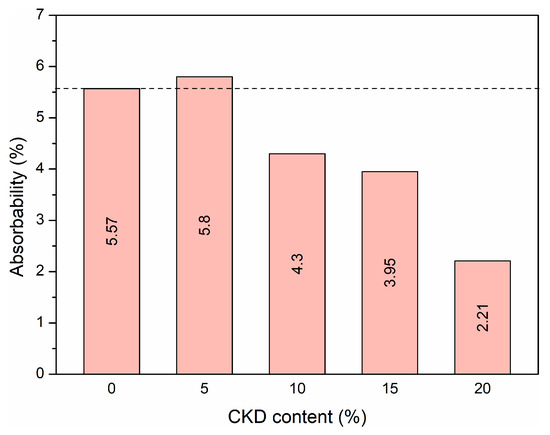It can be seen that water absorption decreased by a maximum of 60% with the addition of CKD to the mixtures. Therefore, CKD improved the absorption properties of concrete and thus can increase its durability. Concrete mixtures containing CKD always showed lower absorption values than the reference mixture without CKD. This can be attributed to the very fine size of the CKD particles.