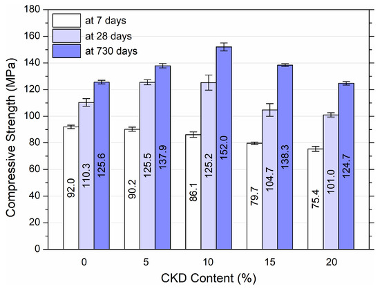 - The compressive strength of HPC increased when the concentration of CKD was 10% after 28 and 730 days of maturation. When the concentration of CKD was 15%, the strength of the HPC was slightly higher than that of the reference sample, and when the concentration of CKD was 20%, it was slightly lower.