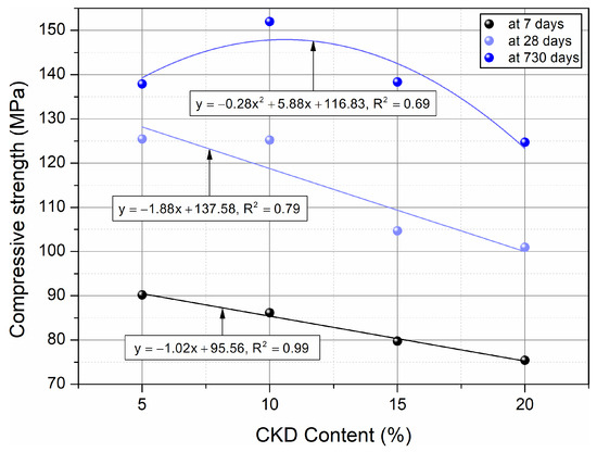Compressive strength of HPC at 7, 28, and 730 days of maturation with variable addition of CKD.