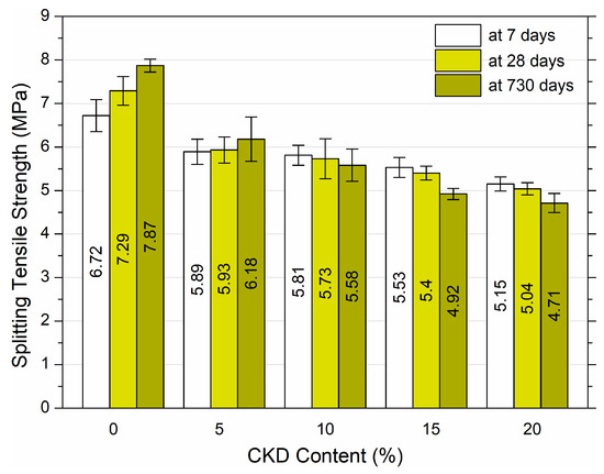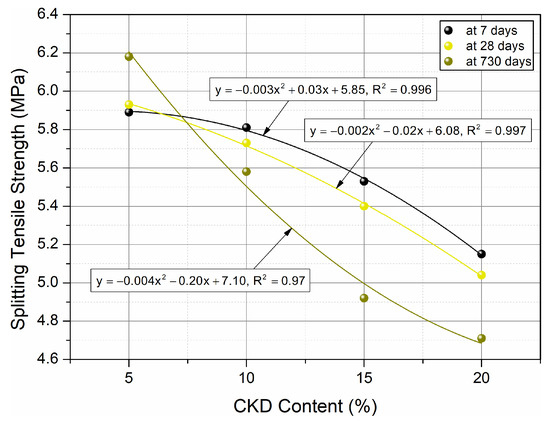 - The value of tensile splitting strength decreased proportionally as the amount of CKD increased. Even the addition of 5% CKD caused a decrease of approximately 20% after 28 and 730 days of maturation. The maximum tensile splitting strength decreases were 30.9% and 40.2% when the concentration of CKD was 20% after 28 and 730 days of curing, respectively.