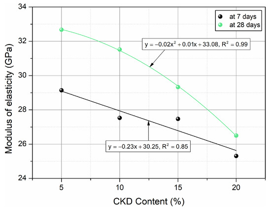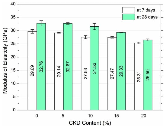 - The elastic modulus gradually decreased with the amount of CKD added. In the case of 10% CKD, after 28 days of maturation, the HPC modulus decreased by only 3.8%. The maximum decline attained at a CKD concentration of 20% was 19.1%.