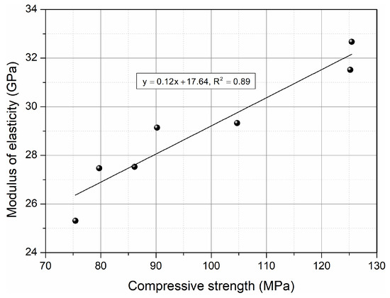 Figure 11 shows the mutual linear relationships between the modulus of elasticity and the compressive strength of HPC with the addition of CKD in the range of 5–20%. It can be seen that as the compressive strength increased, the elastic modulus increased proportionally. The strong R2 value indicates that the modulus of elasticity of HPC that includes cement dust can be estimated from the compressive strength using the presented equation.