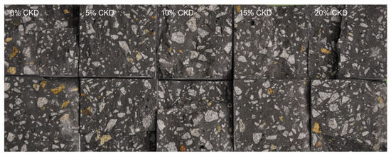 Replacement of cement with CKD (CEMEX, Chełm, Poland) at 1.8 kg for 5%, 3.6 kg for 10%, 5.3 kg for 15%, and 7.1 kg for 20%. The chemical composition of CKD depends on factors at the cement plant, but is similar to typical Portland cement. The chemical composition of the CKD used is shown in Table 2.