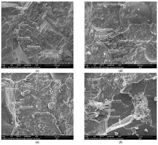 Using a scanning electron microscope (SEM), microphotographs were taken, based on which a qualitative and quantitative analysis of the local microstructure of HPC was carried out. Figure 14a–f shows the images of the HPC mixtures for the 0% CKD control sample and the 20% CKD sample at magnifications of 100, 500, and 2000 times. Pores and areas of their concentration, single grains of fine aggregate, microcracks, loose cement particles, CH (calcium hydroxide/portlandite) crystals, C–S–H (calcium silicate hydrate) gel, as well as locations of interfacial transition zone (ITZ) can be observed.